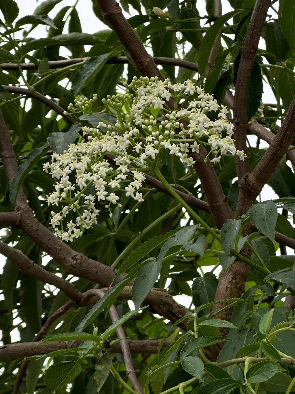 Árbol frondoso de hasta 5 a 6 m de altura de corteza pardo grisácea y ramas cenicientas con médula blanquecina bien desarrollada. Sus hojas opuestas, compuestas y flores pequeñas, blancas, muy aromáticas, dispuestas en un conjunto que asemeja un paraguas su fruto es redondeado de 3 a 5 mm de diámetro, de color negro violáceo y sabor agradable, con tres semillas en su interior.En la medicina propia, se utilizan las flores para tratar los resfríos, por ser sudorífico y eficaz contra la fiebre, la tos y catarros, ya que, descongestiona las vías respiratorias superiores, los frutos no bien maduros pueden ser tóxicos.